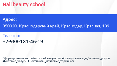 Nail beauty school по адресу 350020, Краснодарский край, Краснодар, Красная, 139 в дальнейшем Организация, размещена в следующих категориях: