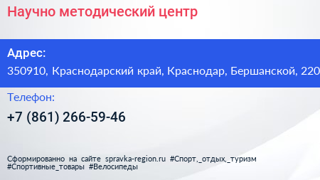 Научно-методический центр по адресу 350910, Краснодарский край, Краснодар, Бершанской, 220 в дальнейшем Организация, размещена в следующих категориях: