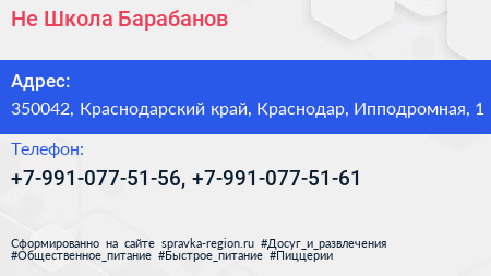 Не Школа Барабанов по адресу 350042, Краснодарский край, Краснодар, Ипподромная, 1 в дальнейшем Организация, размещена в следующих категориях:
