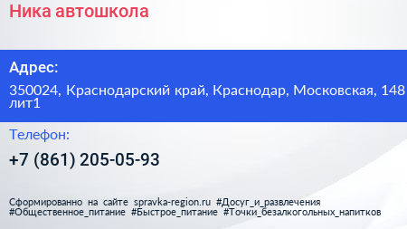 Ника, автошкола по адресу 350024, Краснодарский край, Краснодар, Московская, 148 лит1 в дальнейшем Организация, размещена в следующих категориях: