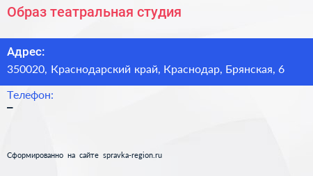 Образ, театральная студия по адресу 350020, Краснодарский край, Краснодар, Брянская, 6 в дальнейшем Организация, размещена в следующих категориях: