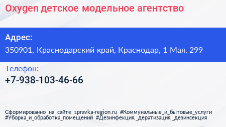 Oxygen, детское модельное агентство по адресу 350901, Краснодарский край, Краснодар, 1 Мая, 299 в дальнейшем Организация, размещена в следующих категориях:
