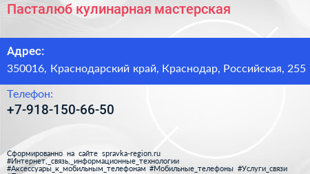 Пасталюб, кулинарная мастерская по адресу 350016, Краснодарский край, Краснодар, Российская, 255 в дальнейшем Организация, размещена в следующих категориях: