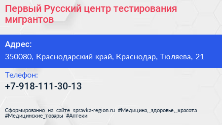 Первый Русский, центр тестирования мигрантов по адресу 350080, Краснодарский край, Краснодар, Тюляева, 21 в дальнейшем Организация, размещена в следующих категориях: