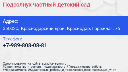 Подсолнух, частный детский сад по адресу 350020, Краснодарский край, Краснодар, Гаражная, 76 в дальнейшем Организация, размещена в следующих категориях: