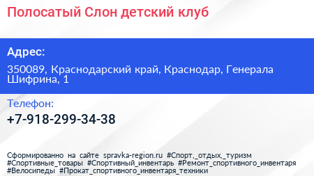 Полосатый Слон, детский клуб по адресу 350089, Краснодарский край, Краснодар, Генерала Шифрина, 1 в дальнейшем Организация, размещена в следующих категориях: