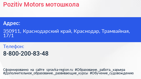 Pozitiv Motors, мотошкола по адресу 350911, Краснодарский край, Краснодар, Трамвайная, 17/1 в дальнейшем Организация, размещена в следующих категориях: