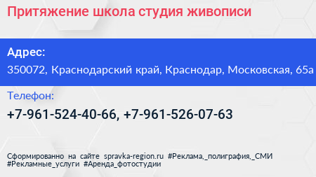 Притяжение, школа-студия живописи по адресу 350072, Краснодарский край, Краснодар, Московская, 65а в дальнейшем Организация, размещена в следующих категориях: