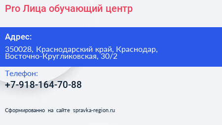 Pro Лица, обучающий центр по адресу 350028, Краснодарский край, Краснодар, Восточно-Кругликовская, 30/2 в дальнейшем Организация, размещена в следующих категориях: