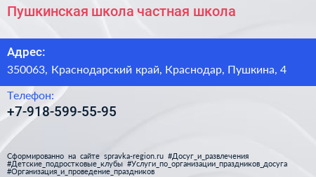 Пушкинская школа, частная школа по адресу 350063, Краснодарский край, Краснодар, Пушкина, 4 в дальнейшем Организация, размещена в следующих категориях: