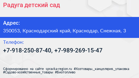 Радуга, детский сад по адресу 350053, Краснодарский край, Краснодар, Снежная, 3 в дальнейшем Организация, размещена в следующих категориях: