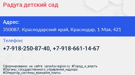Радуга, детский сад по адресу 350087, Краснодарский край, Краснодар, 1 Мая, 421 в дальнейшем Организация, размещена в следующих категориях:
