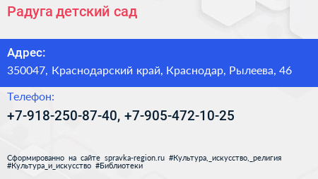 Радуга, детский сад по адресу 350047, Краснодарский край, Краснодар, Рылеева, 46 в дальнейшем Организация, размещена в следующих категориях: