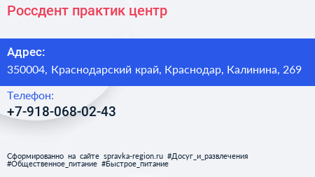 Россдент, практик-центр по адресу 350004, Краснодарский край, Краснодар, Калинина, 269 в дальнейшем Организация, размещена в следующих категориях: