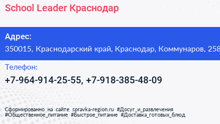 School Leader Краснодар по адресу 350015, Краснодарский край, Краснодар, Коммунаров, 258 в дальнейшем Организация, размещена в следующих категориях: