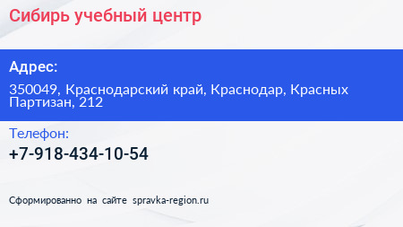 Сибирь, учебный центр по адресу 350049, Краснодарский край, Краснодар, Красных Партизан, 212 в дальнейшем Организация, размещена в следующих категориях:
