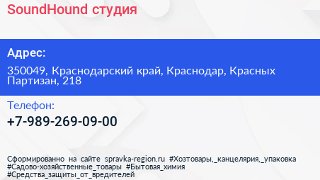SoundHound, студия по адресу 350049, Краснодарский край, Краснодар, Красных Партизан, 218 в дальнейшем Организация, размещена в следующих категориях: