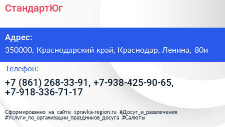 СтандартЮг по адресу 350000, Краснодарский край, Краснодар, Ленина, 80и в дальнейшем Организация, размещена в следующих категориях: