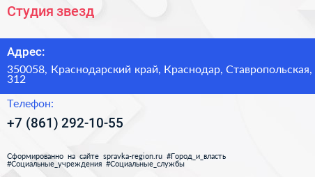 Студия звезд по адресу 350058, Краснодарский край, Краснодар, Ставропольская, 312 в дальнейшем Организация, размещена в следующих категориях: