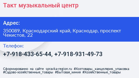 Такт, музыкальный центр по адресу 350089, Краснодарский край, Краснодар, проспект Чекистов, 22 в дальнейшем Организация, размещена в следующих категориях: