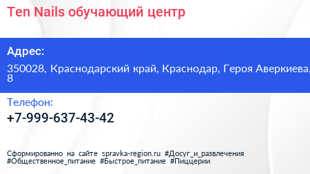 Ten Nails, обучающий центр по адресу 350028, Краснодарский край, Краснодар, Героя Аверкиева, 8 в дальнейшем Организация, размещена в следующих категориях: