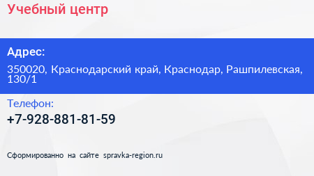 Учебный центр по адресу 350020, Краснодарский край, Краснодар, Рашпилевская, 130/1 в дальнейшем Организация, размещена в следующих категориях: