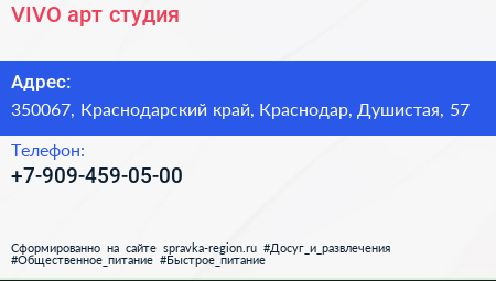 VIVO, арт-студия по адресу 350067, Краснодарский край, Краснодар, Душистая, 57 в дальнейшем Организация, размещена в следующих категориях: