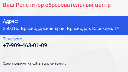Ваш Репетитор, образовательный центр по адресу 350016, Краснодарский край, Краснодар, Карякина, 19 в дальнейшем Организация, размещена в следующих категориях: