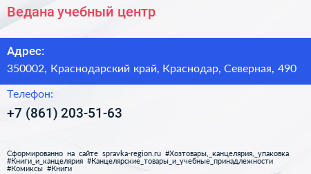 Ведана, учебный центр по адресу 350002, Краснодарский край, Краснодар, Северная, 490 в дальнейшем Организация, размещена в следующих категориях: