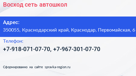 Восход, сеть автошкол по адресу 350055, Краснодарский край, Краснодар, Первомайская, 6 в дальнейшем Организация, размещена в следующих категориях: