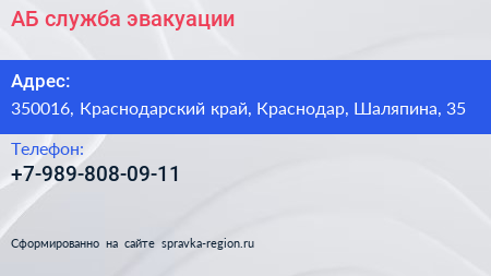 АБ, служба эвакуации по адресу 350016, Краснодарский край, Краснодар, Шаляпина, 35 в дальнейшем Организация, размещена в следующих категориях: