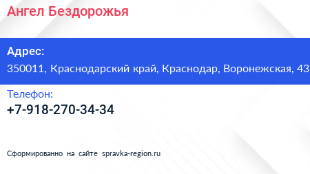 Ангел Бездорожья по адресу 350011, Краснодарский край, Краснодар, Воронежская, 43 в дальнейшем Организация, размещена в следующих категориях: