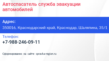 Автоспасатель, служба эвакуации автомобилей по адресу 350016, Краснодарский край, Краснодар, Шаляпина, 35/1 в дальнейшем Организация, размещена в следующих категориях: