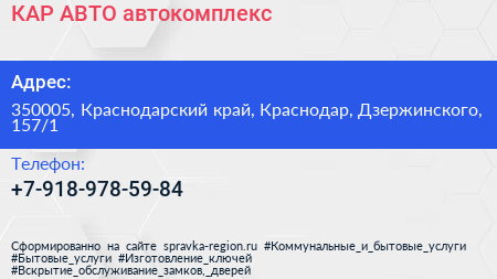 КАР-АВТО, автокомплекс по адресу 350005, Краснодарский край, Краснодар, Дзержинского, 157/1 в дальнейшем Организация, размещена в следующих категориях: