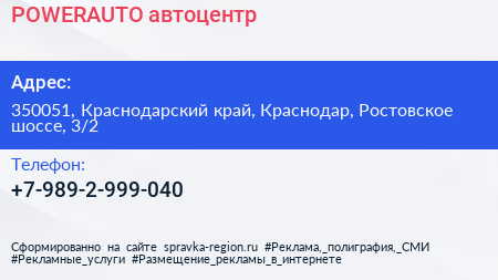 POWERAUTO, автоцентр по адресу 350051, Краснодарский край, Краснодар, Ростовское шоссе, 3/2 в дальнейшем Организация, размещена в следующих категориях: