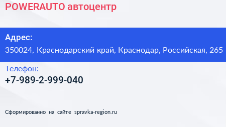 POWERAUTO, автоцентр по адресу 350024, Краснодарский край, Краснодар, Российская, 265 в дальнейшем Организация, размещена в следующих категориях: