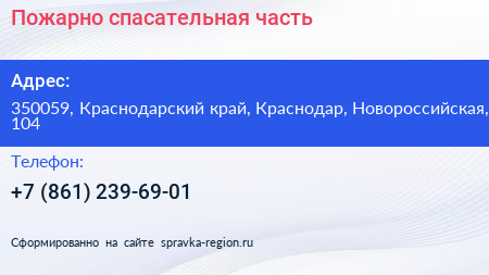Пожарно-спасательная часть по адресу 350059, Краснодарский край, Краснодар, Новороссийская, 104 в дальнейшем Организация, размещена в следующих категориях: