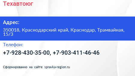 Техавтоюг по адресу 350018, Краснодарский край, Краснодар, Трамвайная, 15/3 в дальнейшем Организация, размещена в следующих категориях: