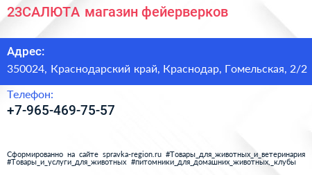 23САЛЮТА, магазин фейерверков по адресу 350024, Краснодарский край, Краснодар, Гомельская, 2/2 в дальнейшем Организация, размещена в следующих категориях: