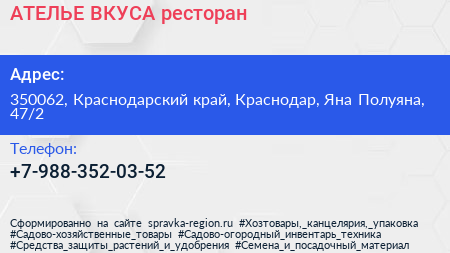 АТЕЛЬЕ ВКУСА, ресторан по адресу 350062, Краснодарский край, Краснодар, Яна Полуяна, 47/2 в дальнейшем Организация, размещена в следующих категориях: