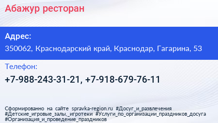 Абажур, ресторан по адресу 350062, Краснодарский край, Краснодар, Гагарина, 53 в дальнейшем Организация, размещена в следующих категориях: