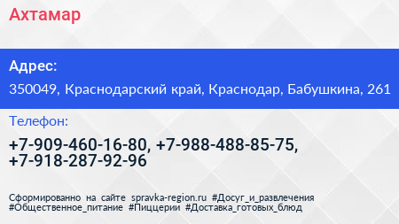 Ахтамар по адресу 350049, Краснодарский край, Краснодар, Бабушкина, 261 в дальнейшем Организация, размещена в следующих категориях: