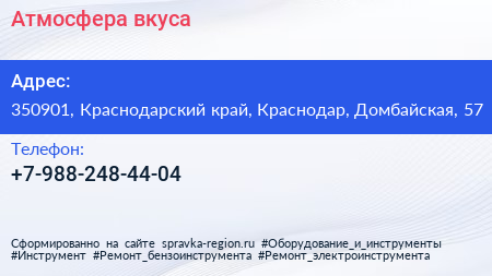 Атмосфера вкуса по адресу 350901, Краснодарский край, Краснодар, Домбайская, 57 в дальнейшем Организация, размещена в следующих категориях: