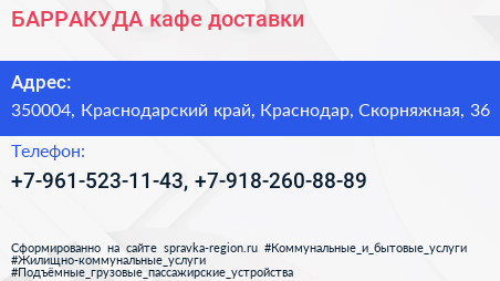 БАРРАКУДА, кафе доставки по адресу 350004, Краснодарский край, Краснодар, Скорняжная, 36 в дальнейшем Организация, размещена в следующих категориях: