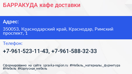 БАРРАКУДА, кафе доставки по адресу 350053, Краснодарский край, Краснодар, Римский проспект, 1 в дальнейшем Организация, размещена в следующих категориях: