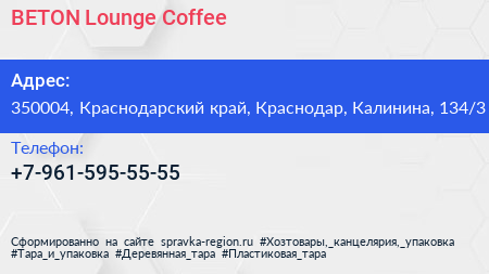 BETON Lounge & Coffee по адресу 350004, Краснодарский край, Краснодар, Калинина, 134/3 в дальнейшем Организация, размещена в следующих категориях: