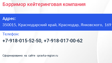 Бэрримор, кейтеринговая компания по адресу 350015, Краснодарский край, Краснодар, Янковского, 169 в дальнейшем Организация, размещена в следующих категориях: