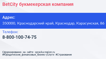 BetCity, букмекерская компания по адресу 350000, Краснодарский край, Краснодар, Карасунская, 86 в дальнейшем Организация, размещена в следующих категориях: