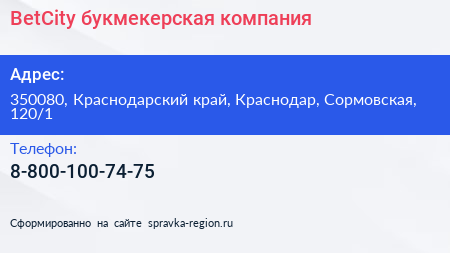 BetCity, букмекерская компания по адресу 350080, Краснодарский край, Краснодар, Сормовская, 120/1 в дальнейшем Организация, размещена в следующих категориях: