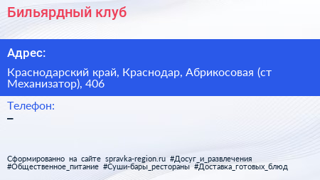 Бильярдный клуб по адресу Краснодарский край, Краснодар, Абрикосовая (ст Механизатор), 406 в дальнейшем Организация, размещена в следующих категориях: